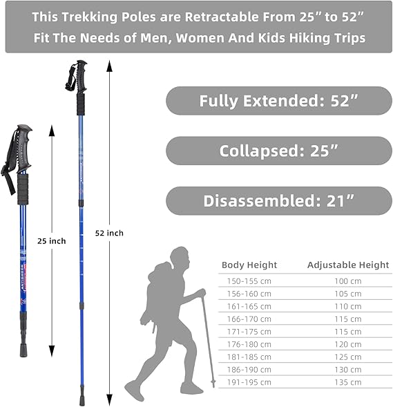 - ✔High Quality – The Collapsible Hiking Sticks Are Made Of Premium Quality Aviation Aluminum, Each Poles Only Weights 10.3 Oz,Which Is Sturdy, Lightweight And Easy To Adjust, This Trekking Poles are Retractable From 25” to 52”, Fit The Needs of Men, Women And Kids Hiking Trips